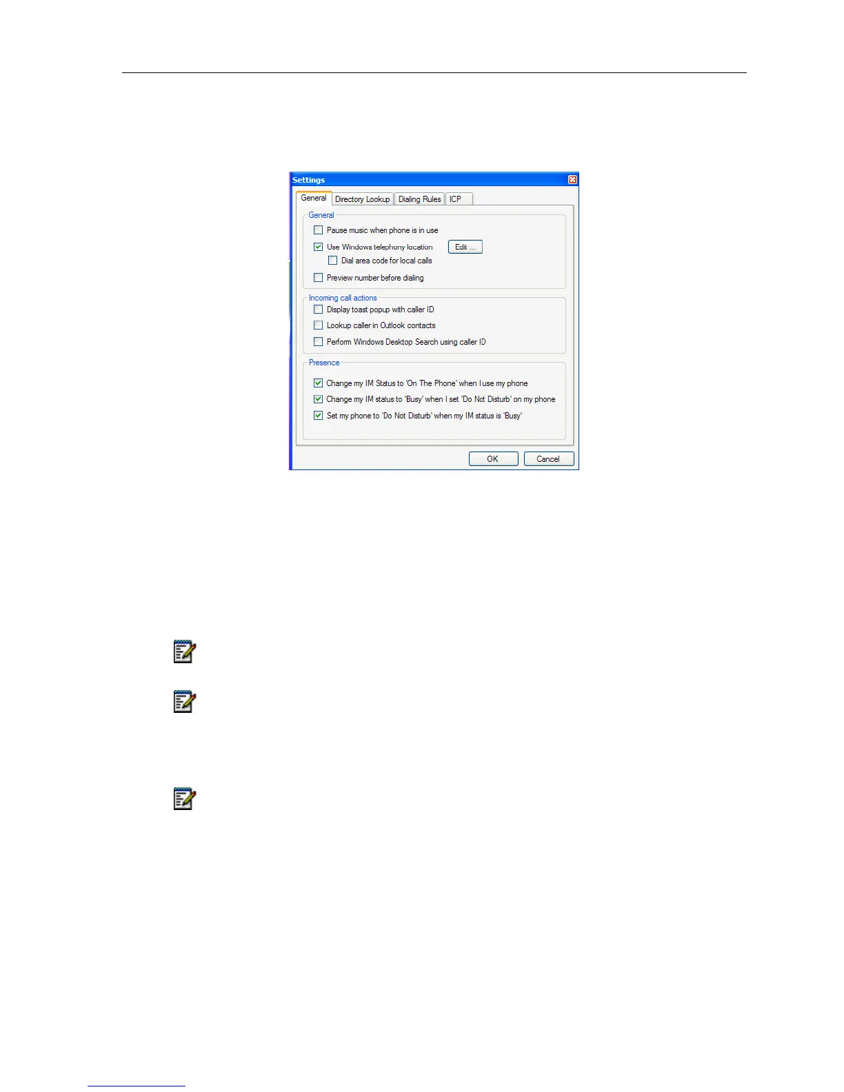 To open the Settings dialog window, select Settings from the Telephony Toolbar menu or