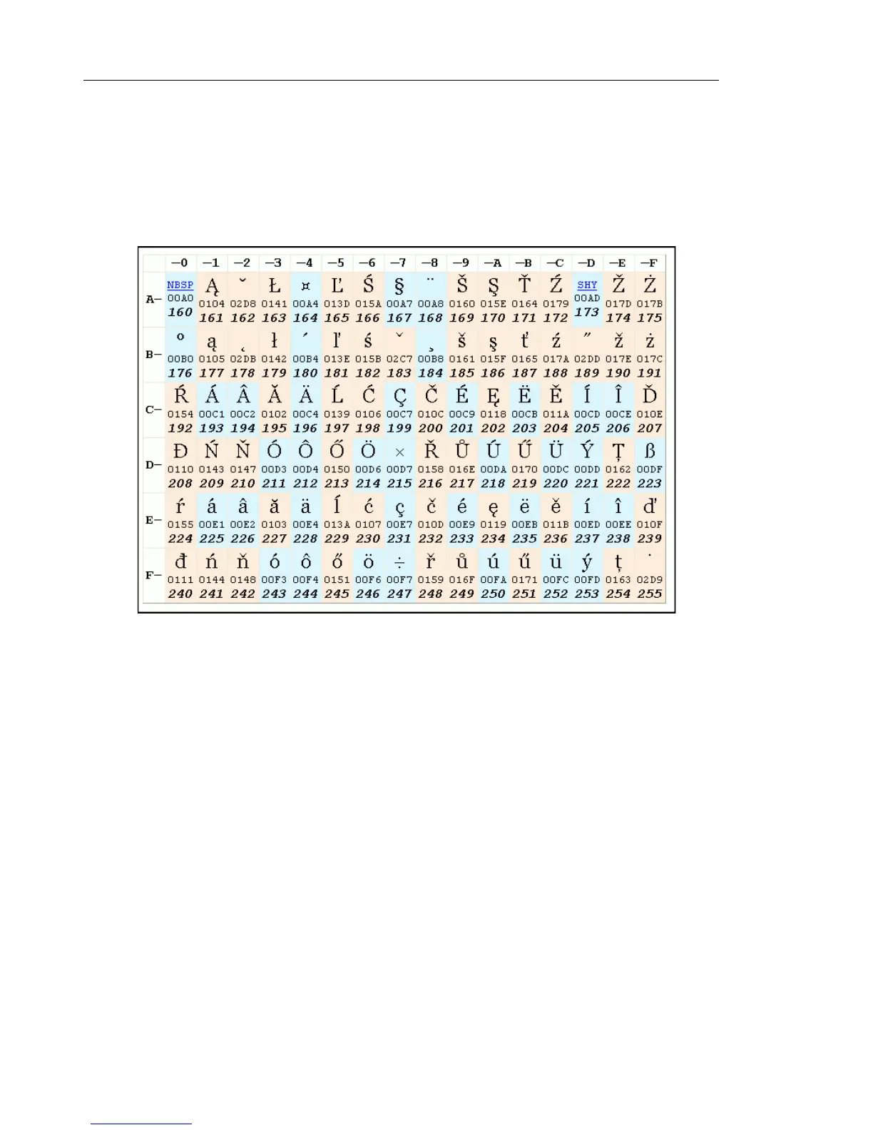 The following table illustrates the Latin 2 character set used on the 6863i IP phone.