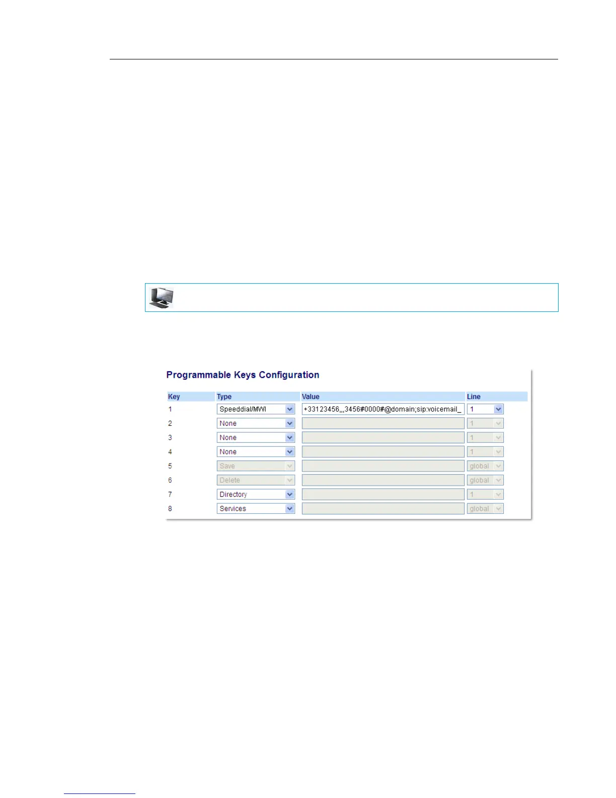 By configuring a key as “Speeddial/MWI” and defining call and voicemail URIs, you can monitor