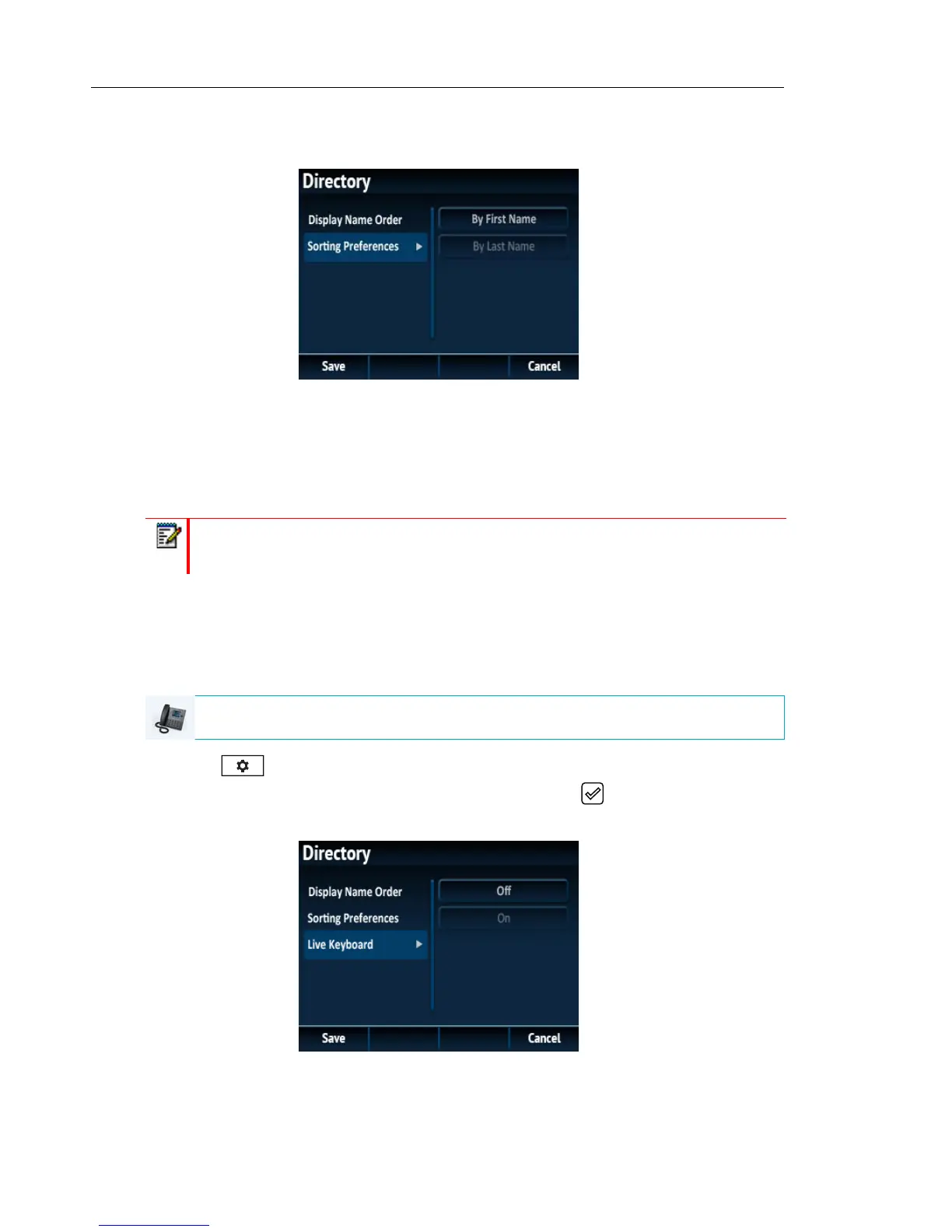 2. Navigate to the Directory > Settings option and press the button or Select softkey.