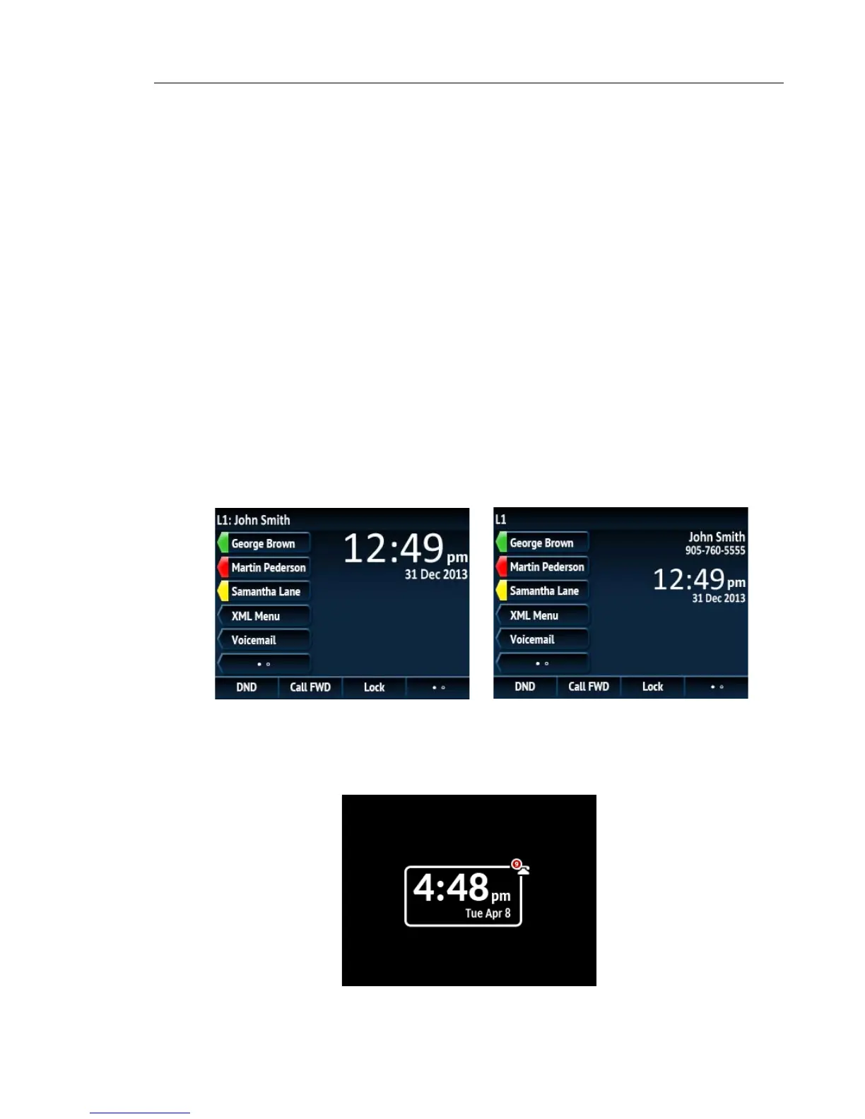 a screen saver displaying the date and time and the number of missed calls (if applicable) is
