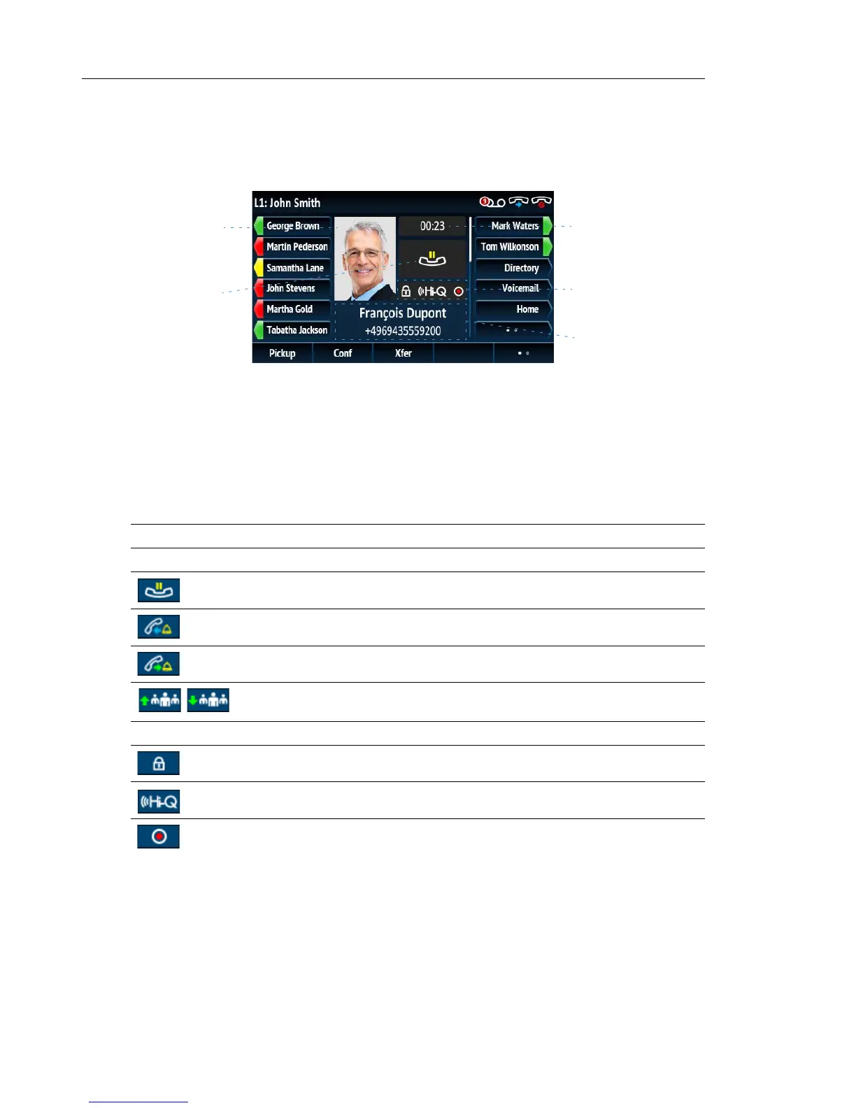 (name and number), and call status and feature indicators.