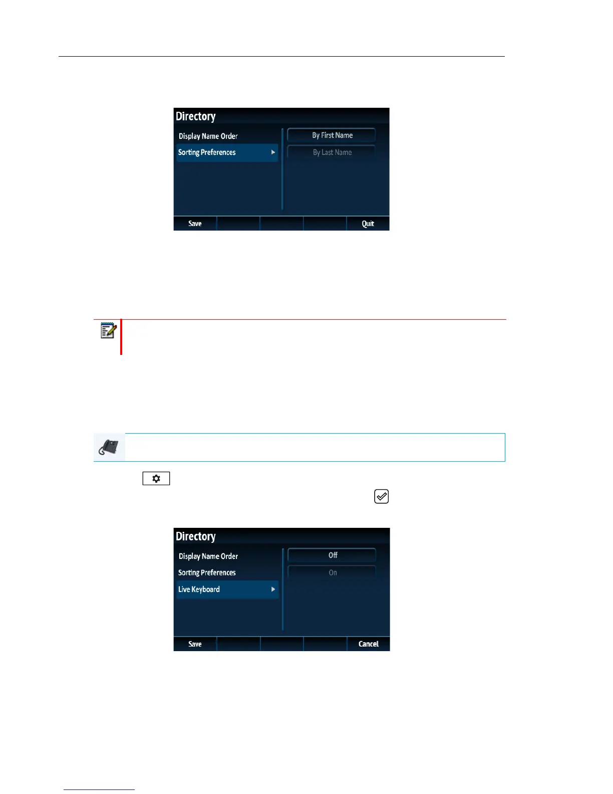 2. Navigate to the Directory > Settings option and press the button or Select softkey.
