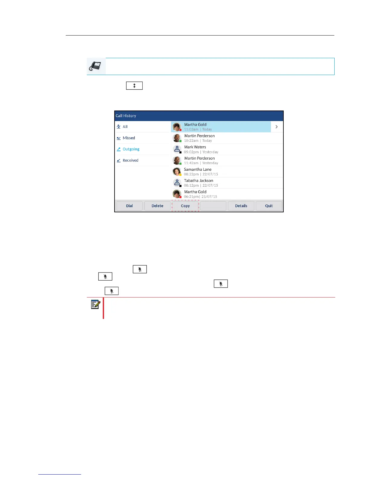 Note: If you place a muted call on hold, the phone automatically takes the call off mute