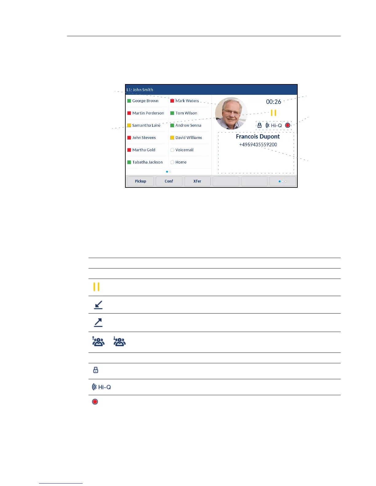 (name and number), and call status and feature indicators.