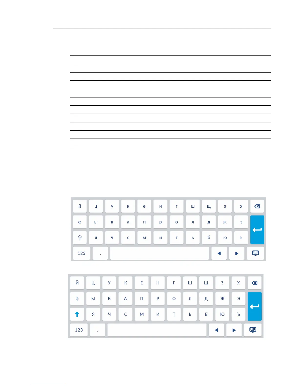 When the phone’s input language is configured as Russian, the following keyboard layouts are