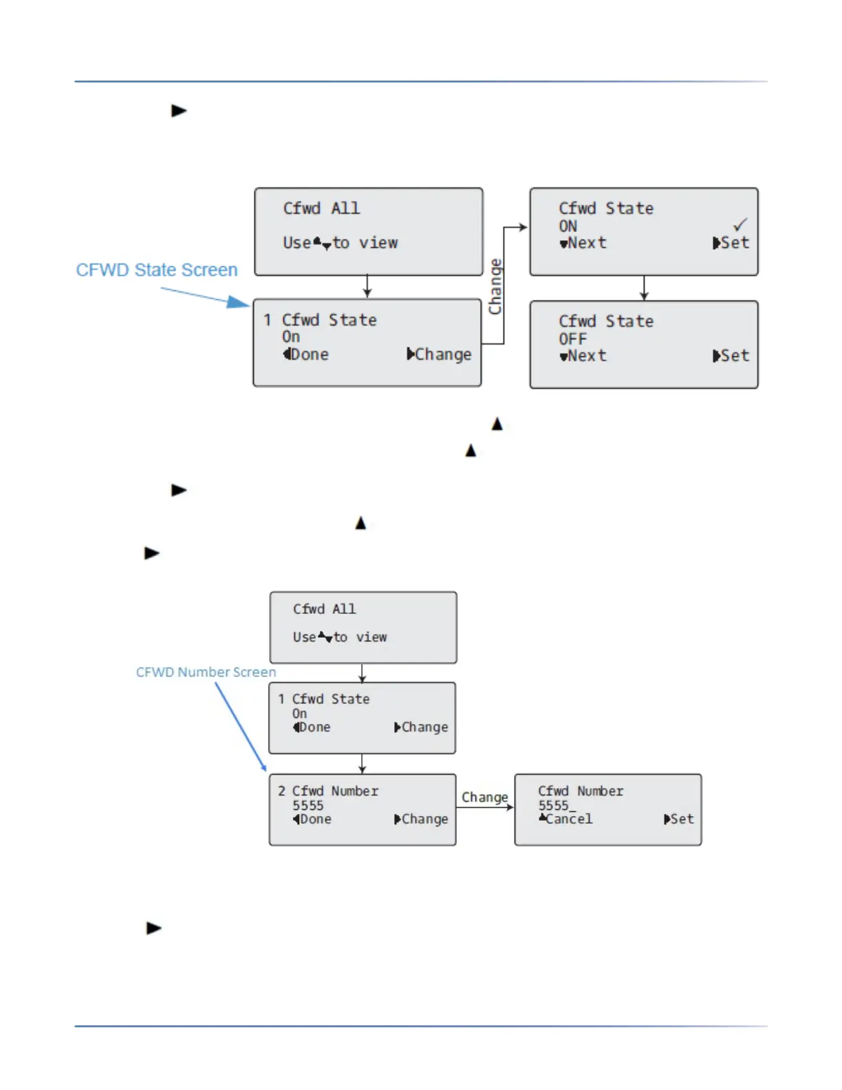 7. Press the Change key for the mode you selected in Step 2. Scroll to the CFWD State screen.