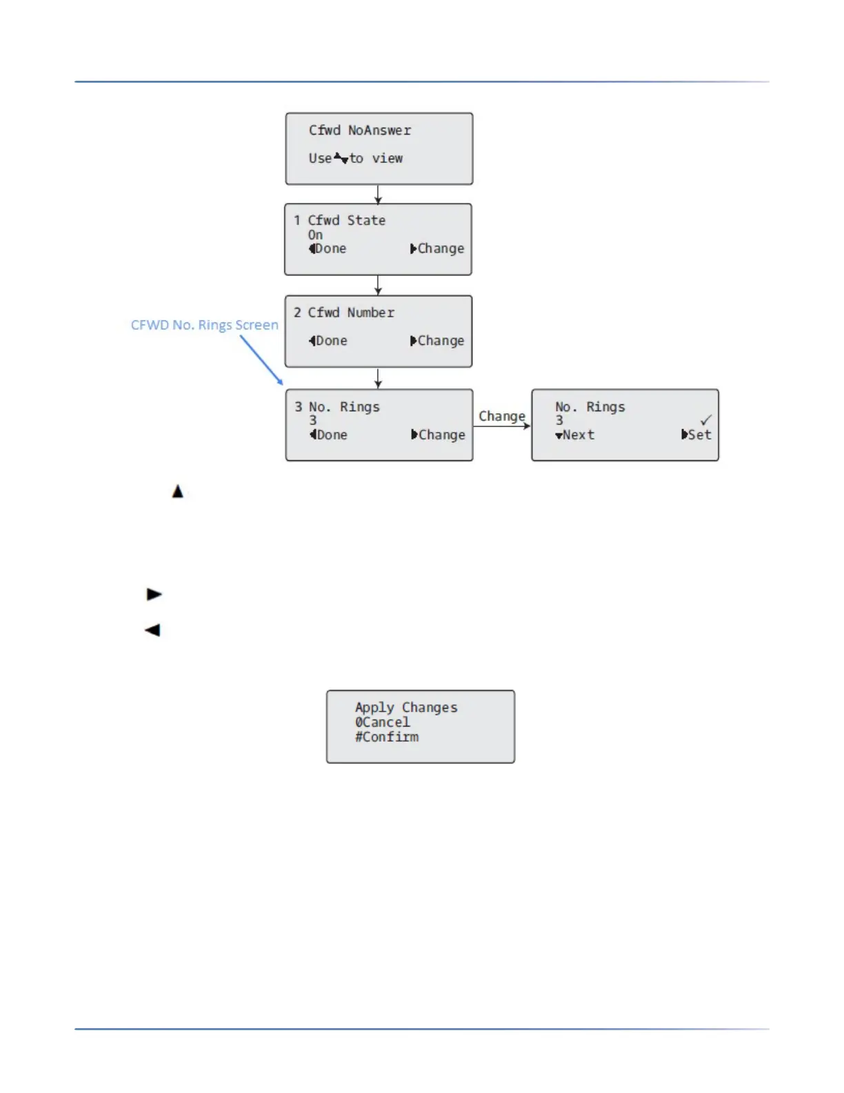 13. Press the Next key to select the number of rings to apply to the phone for call for-warding