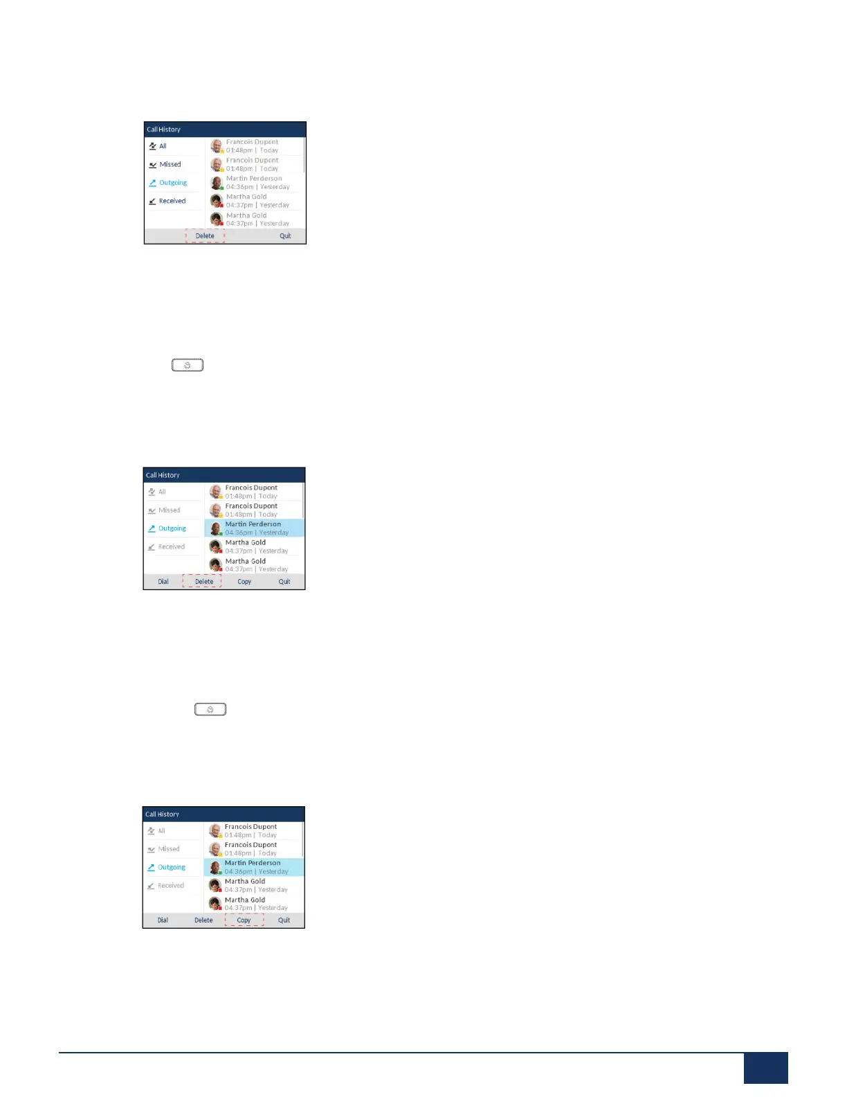 3. Use the up and down navigation keys to scroll through the entries in the Outgoing Redial List.
