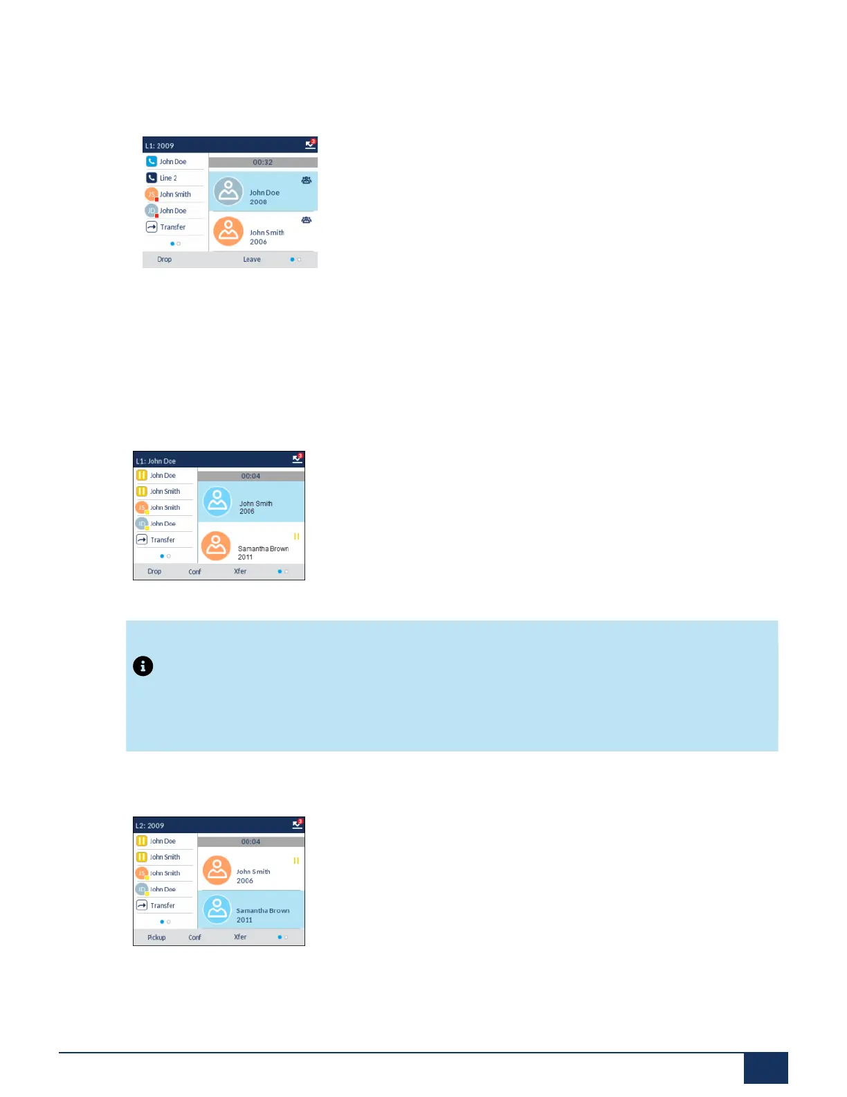 7. Press the Conf softkey again to add Party 3 to the conference. Party 2 and Party 3 will connect with you