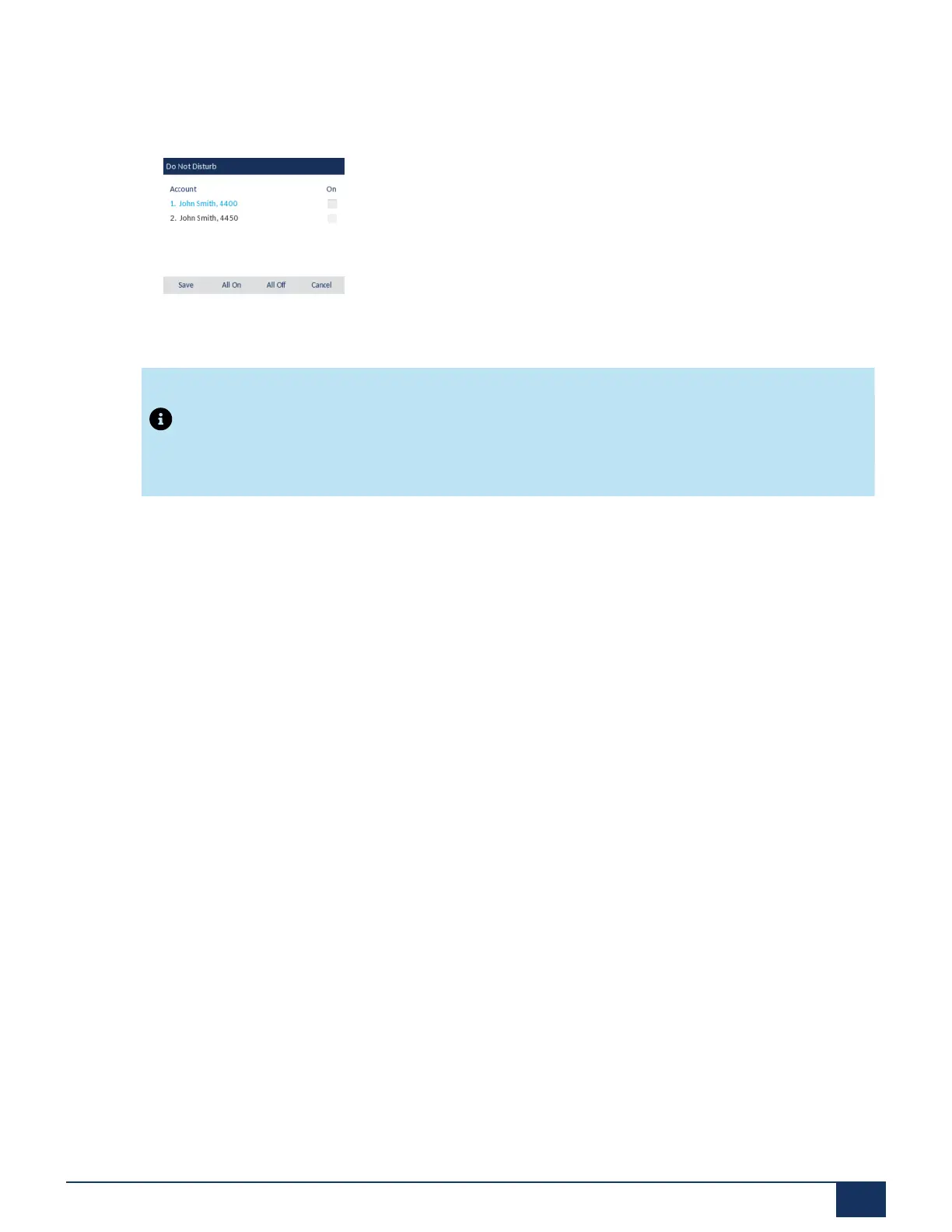 Press the All On or All Off softkeys to quickly enable or disable DND for all accounts.