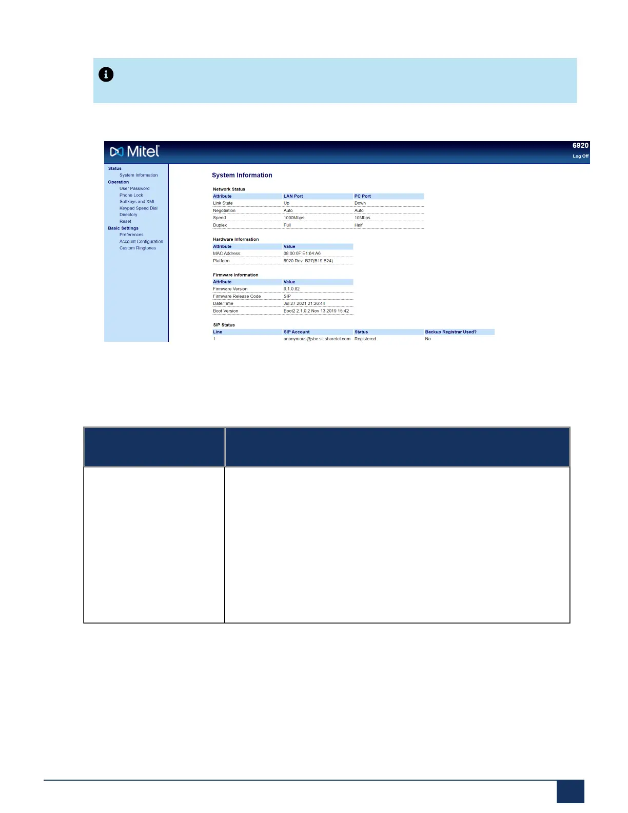 The following categories display in the side menu of the Mitel Web UI: Status, Operation, and Basic