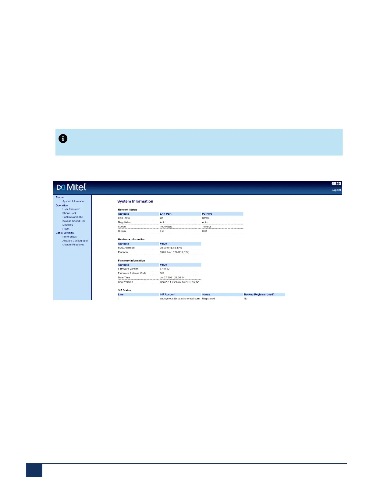 The IP phones show the SIP registration status on the IP phone’s Status screen in the Mitel Web UI.