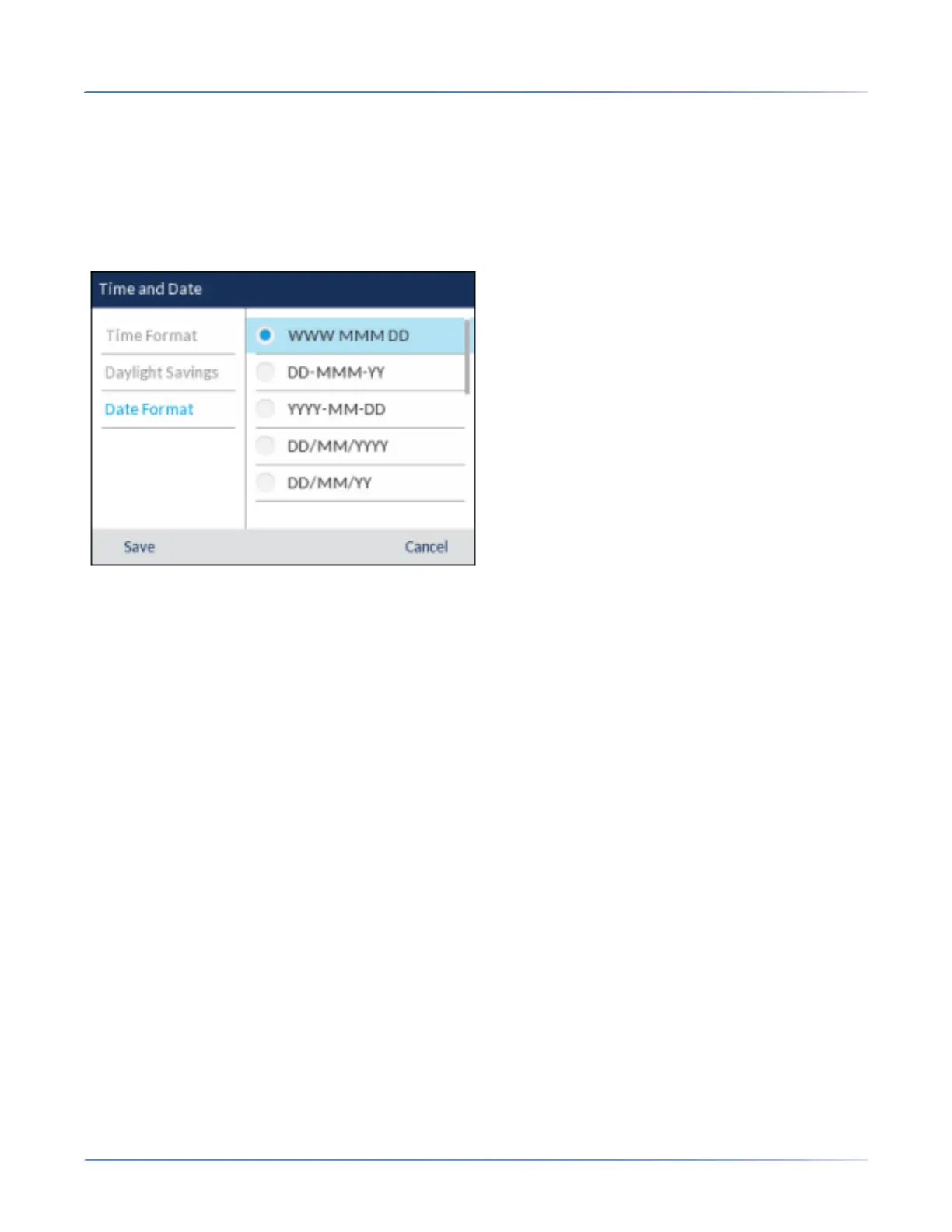 10. Use the up and down navigation keys to scroll through and choose the desired date format. Valid