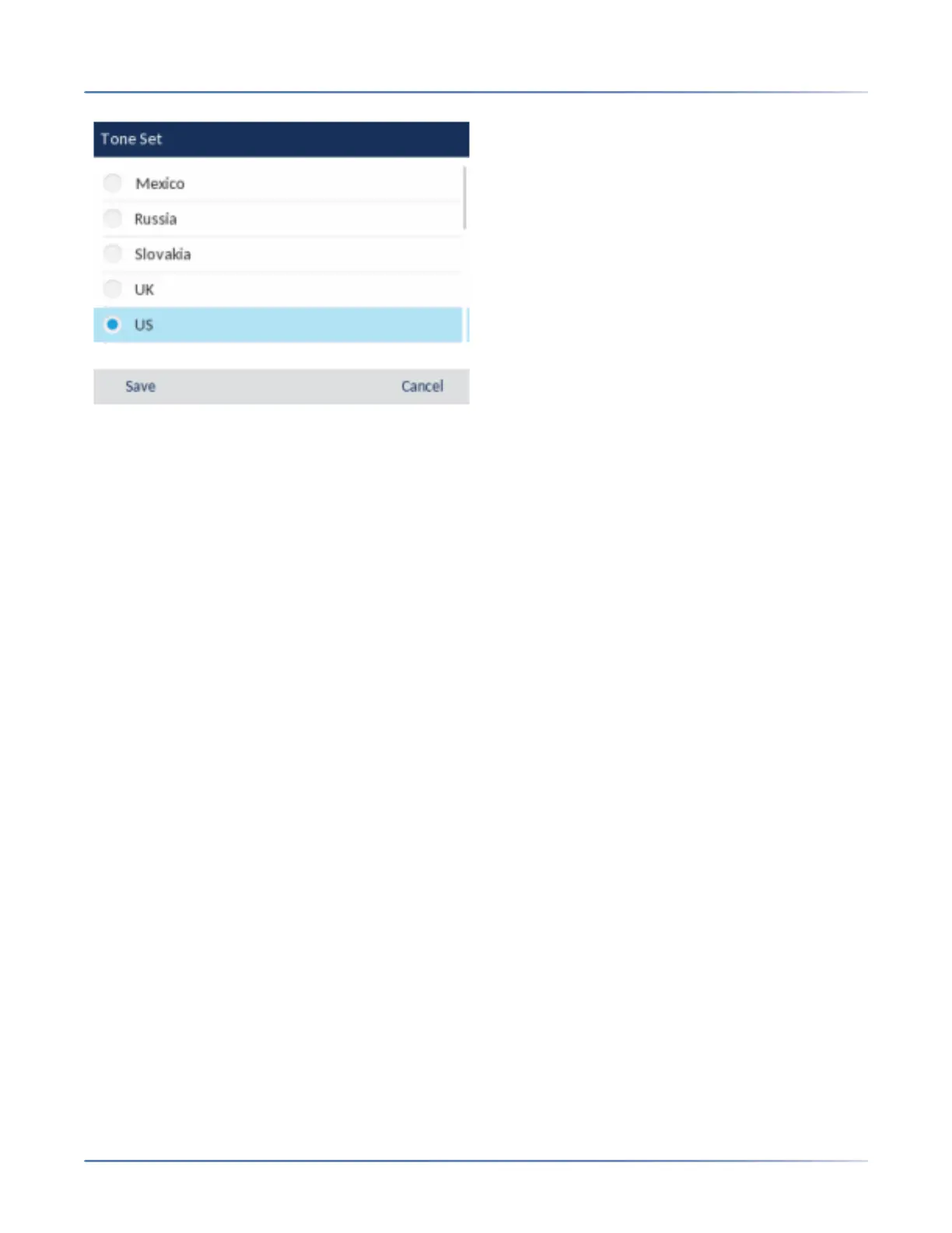 4. Press the Save softkey to save your changes.The tone set you select is immediately applied to the IP