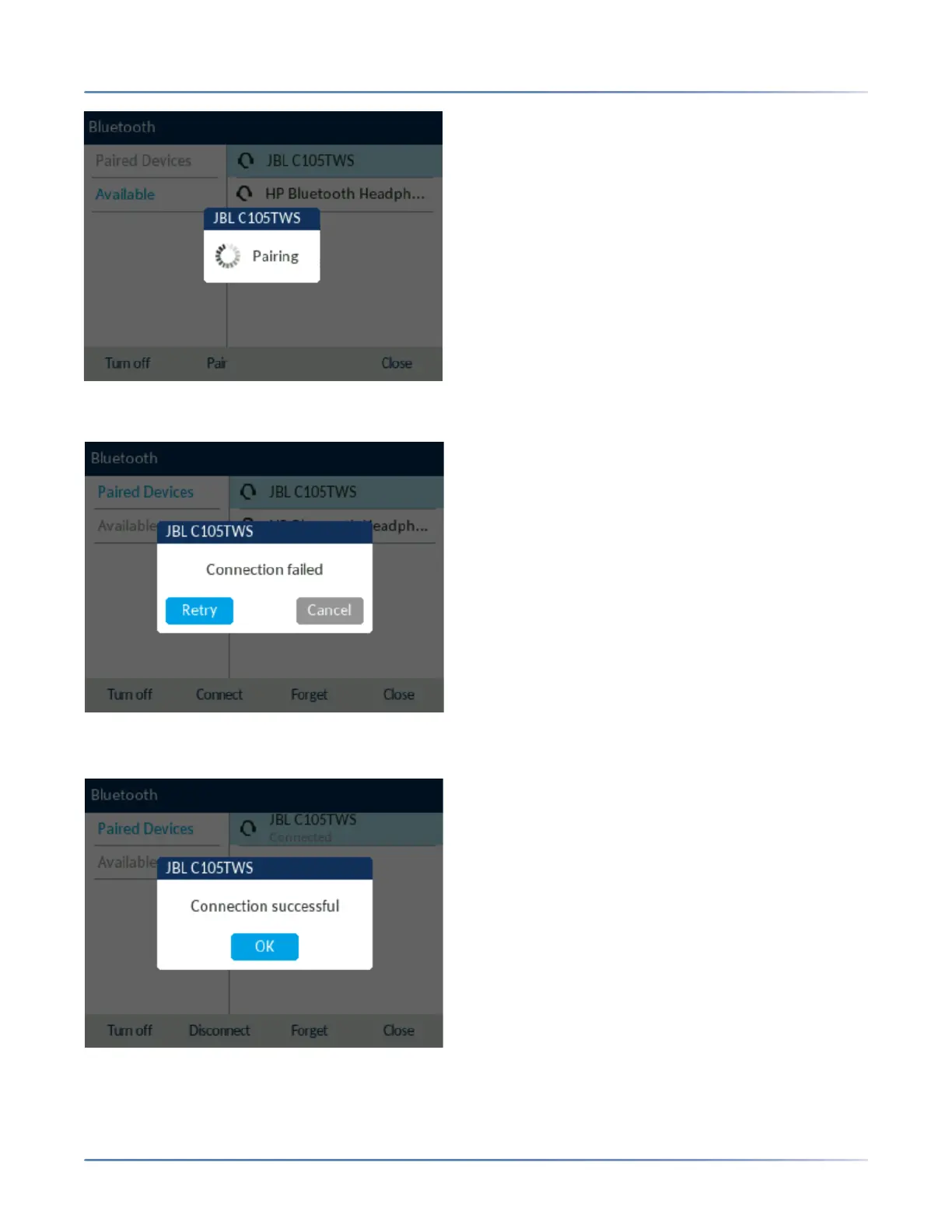 NOTE: If pairing or connecting fails, a failed error message displays on screen. Press Retry to