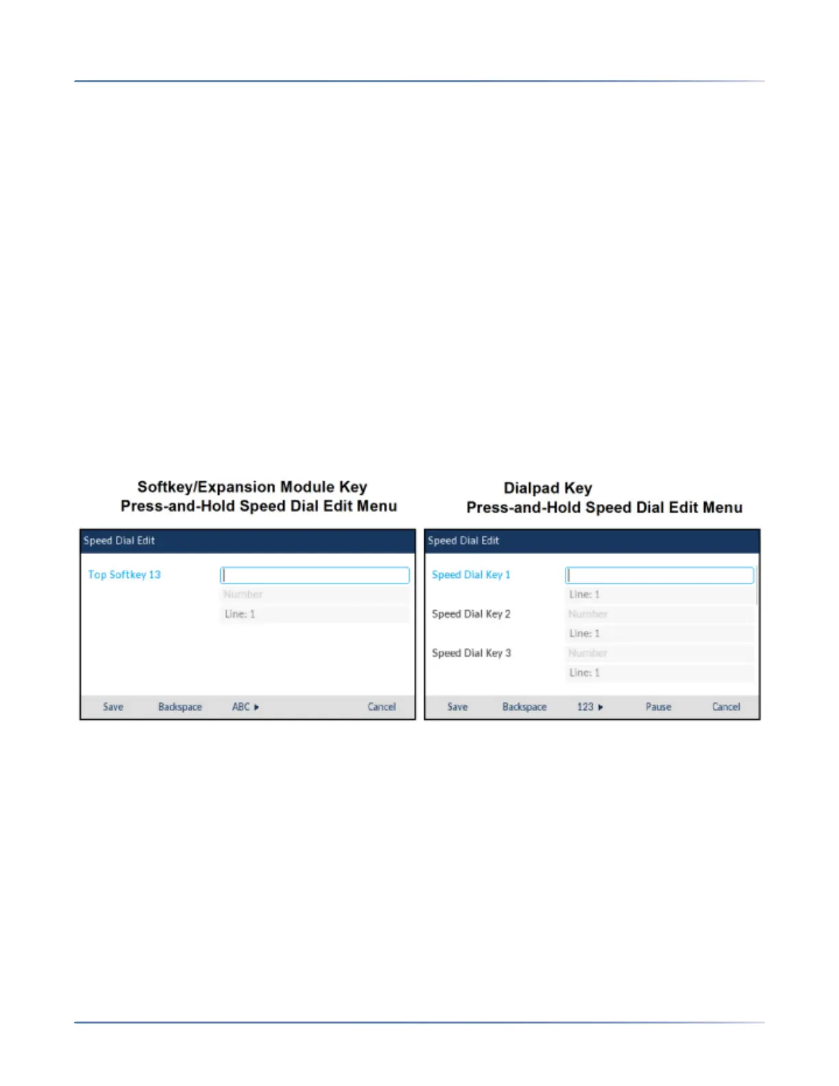 Pressing and holding a softkey, dialpad key, or expansion module key on the phone initiates a speed dial