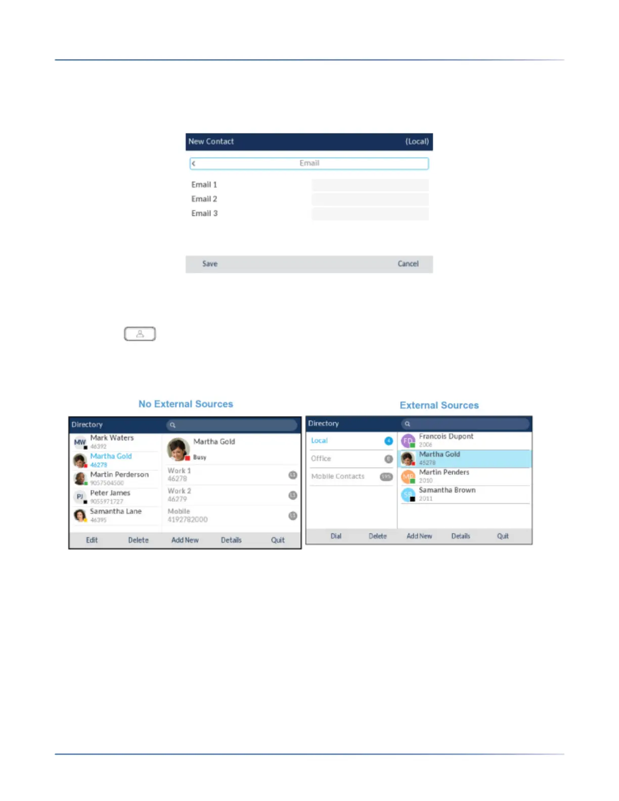1. Press the key or a softkey configured with Directory functionality to enter the Directory.