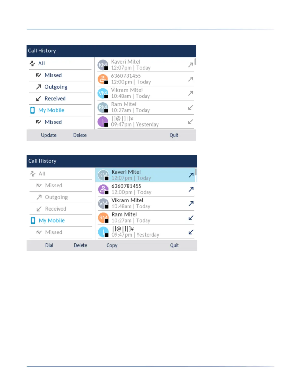 4. Press the right navigation key to move to the call history or missed calls selection column.