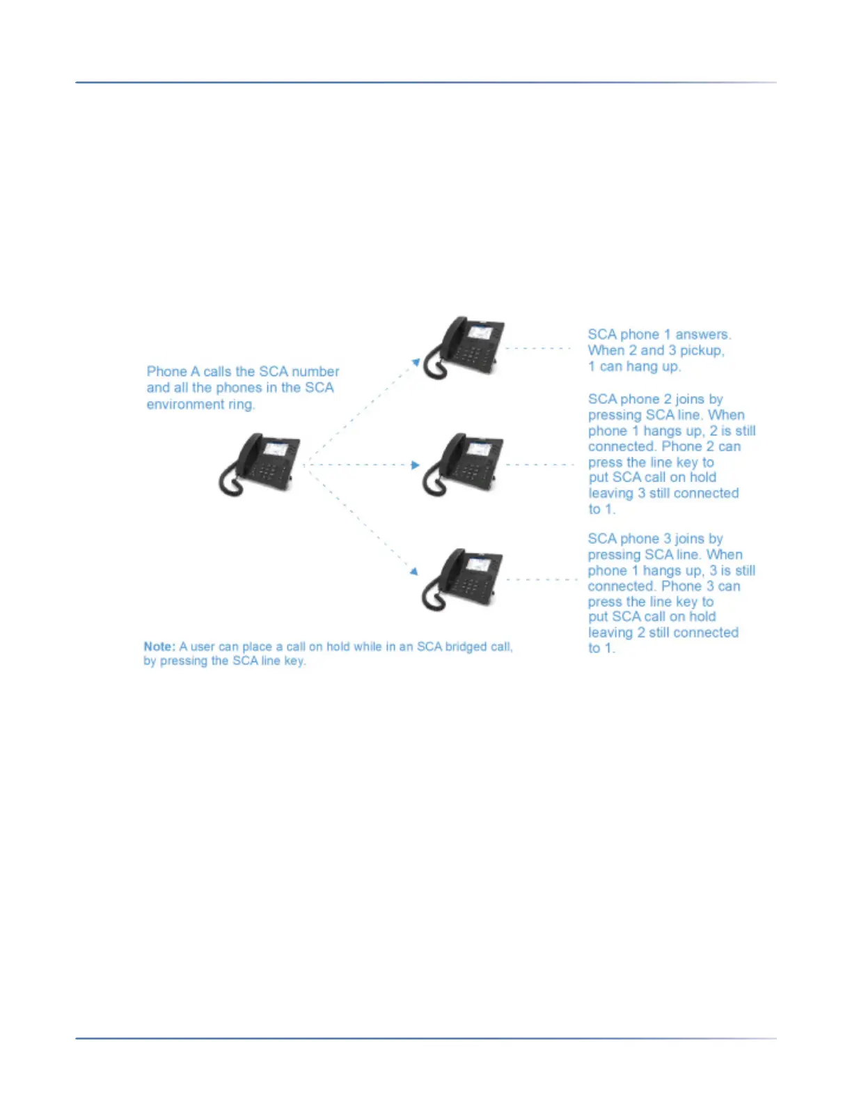 call by pressing the SCA line key. Phone 2 and 3 display the call they are bridging into on the LCD of the