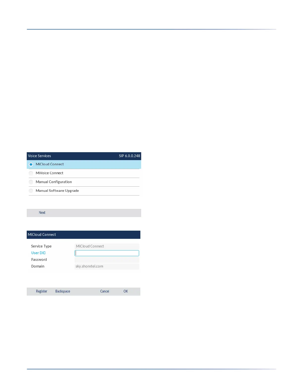 After the initial boot-up of the IP phone, a Voice Services screen auto-prompts the user to select an