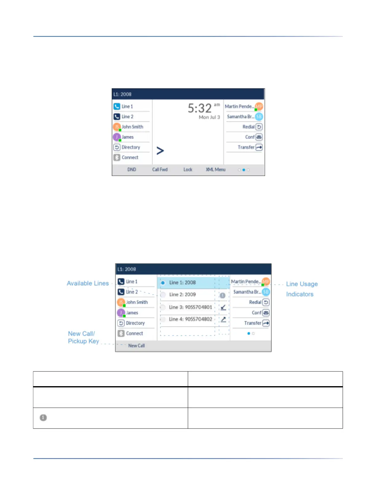 The following table identifies and describes the line usage indicators on the Line Selection screen.>