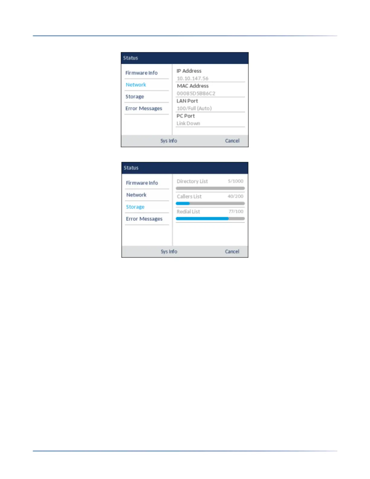 b. If the Received Callers List or Outgoing Redial List is full, the Storage screen displays informa-