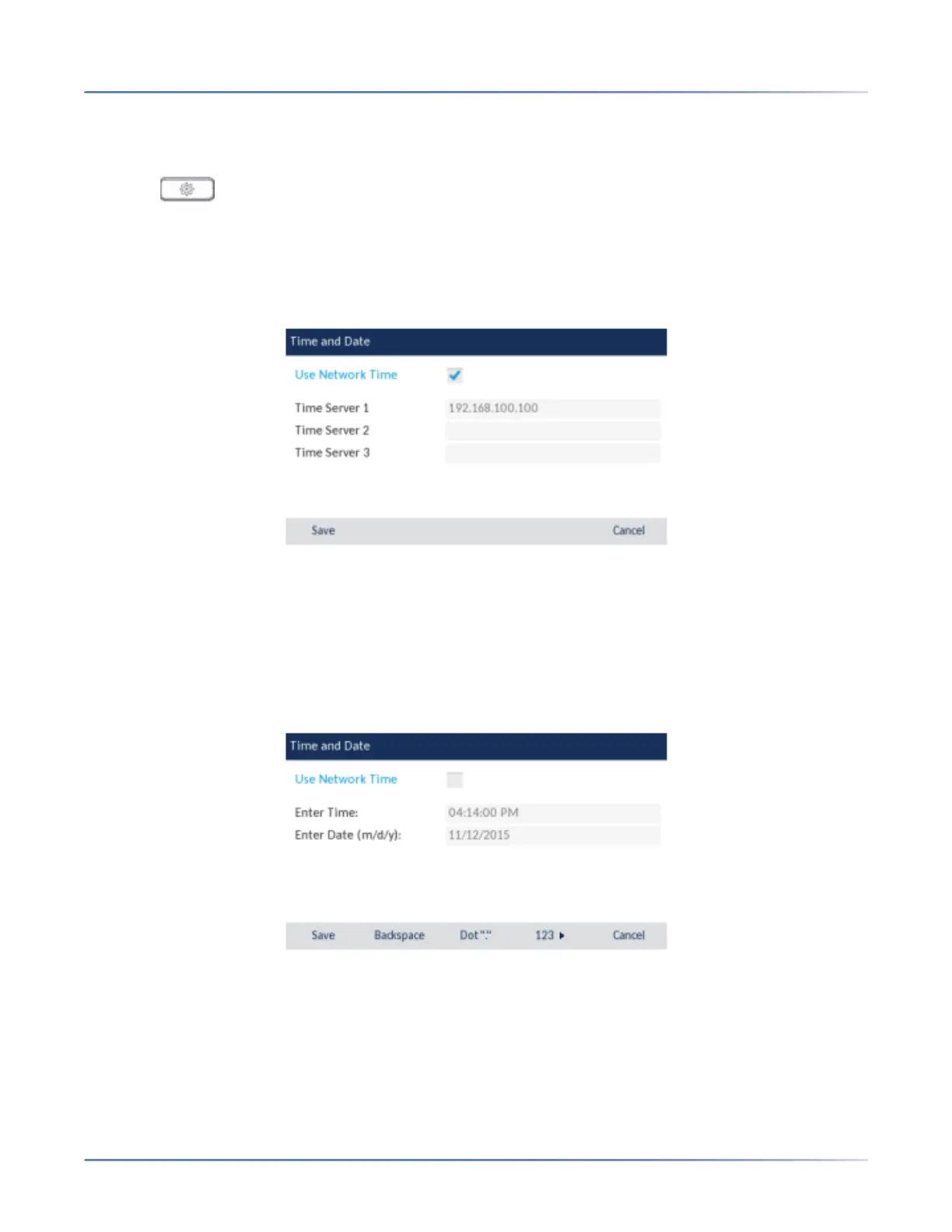 2. Using the keys on the dialpad, enter an IP address or domain name for the time server. Use the Back-