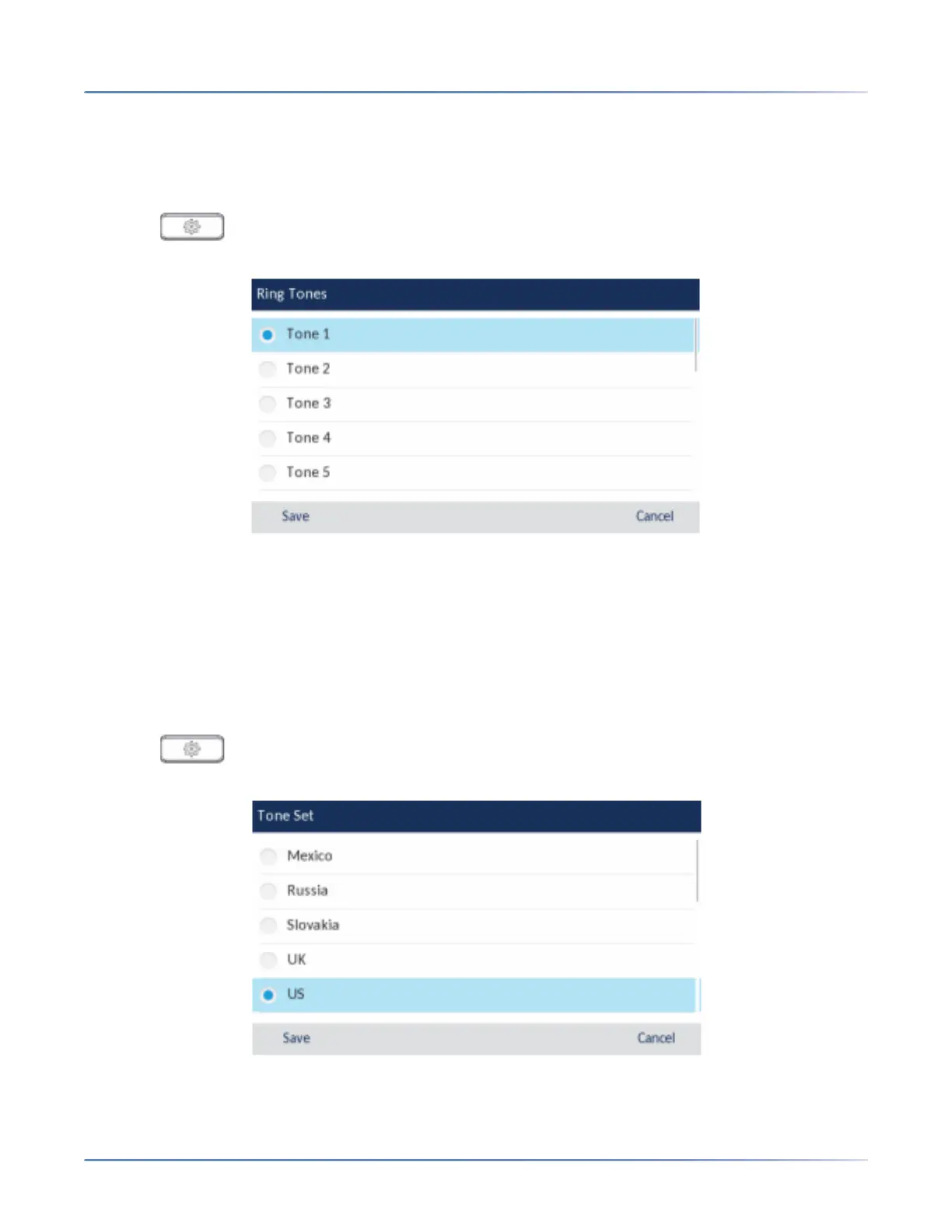 2. Navigate to the Audio > Tone Sets option and press the select button or Select softkey.