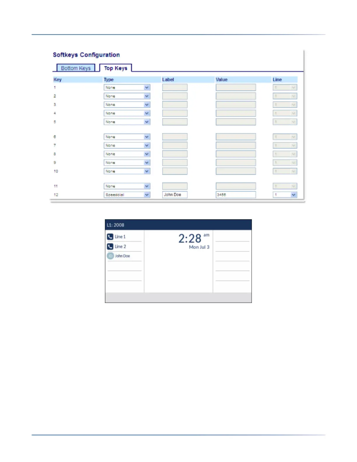 and Line 2 hardkeys. By default, the line values for top softkey 1 and topsoftkey 2 are set to Line 1 and