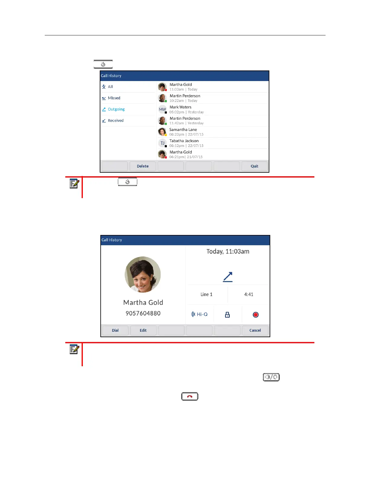 To dial the displayed number while in the Outgoing Redial List, press , press the
