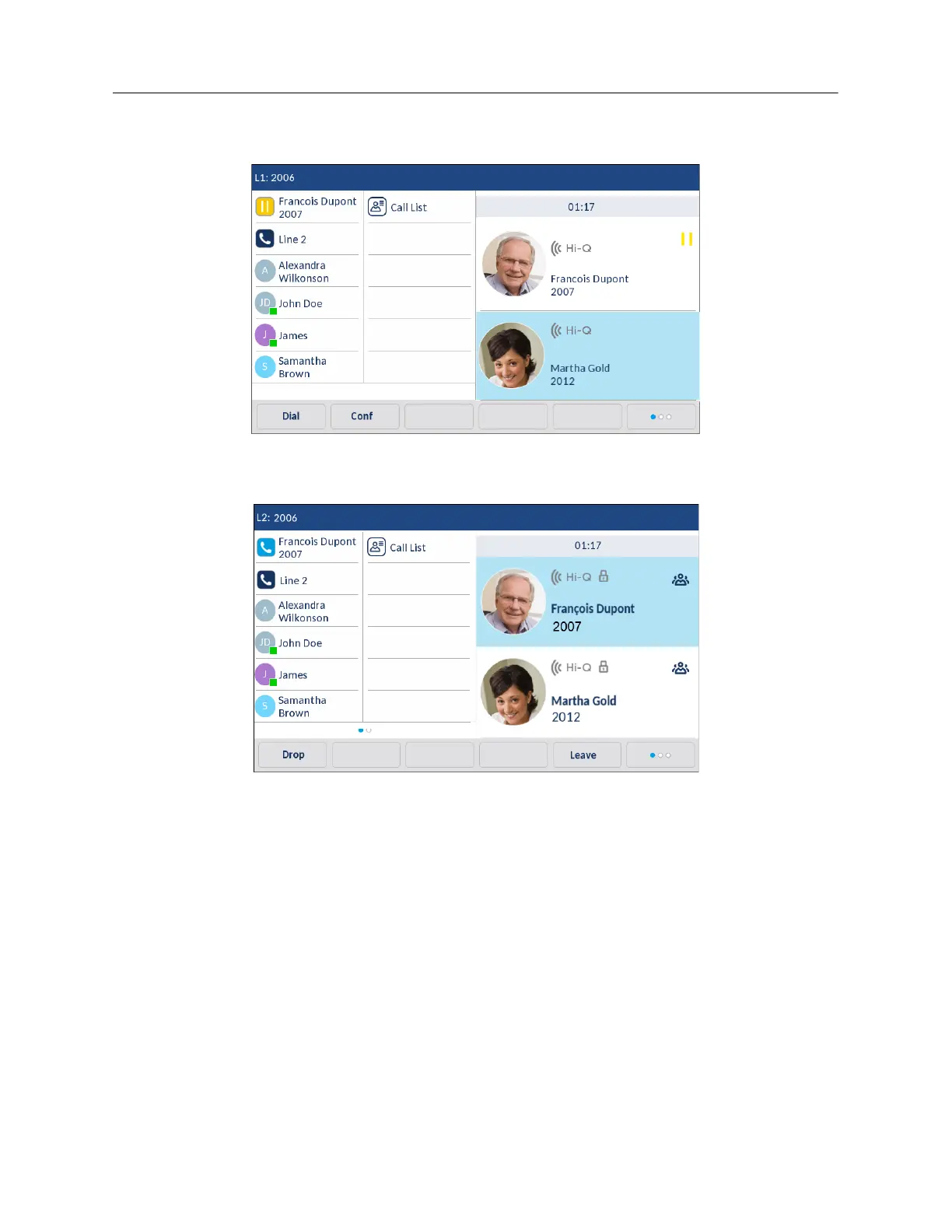 To drop a party from the conference, swipe up and down to scroll, press the desired party, and