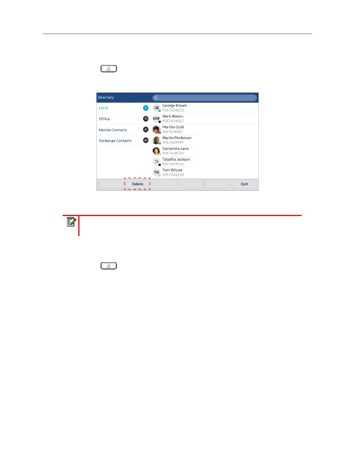 In the Local Directory folder press the contact you want to delete.