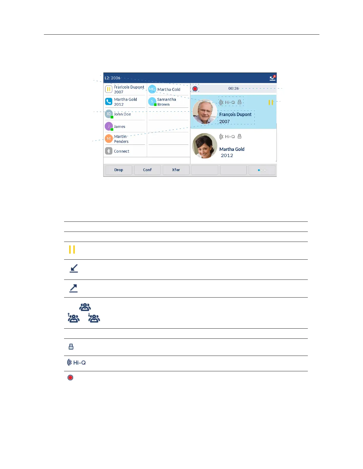 Indicates the party is a conference call participant. The direction of the arrow (if