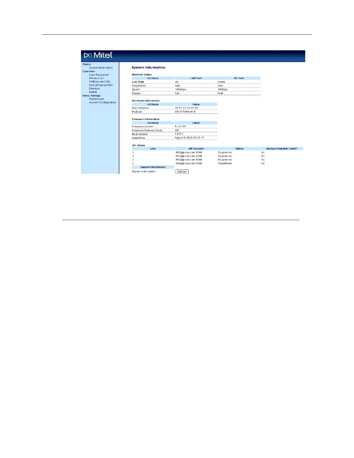 Status The Status section displays the network status and the MAC address of the IP phone.