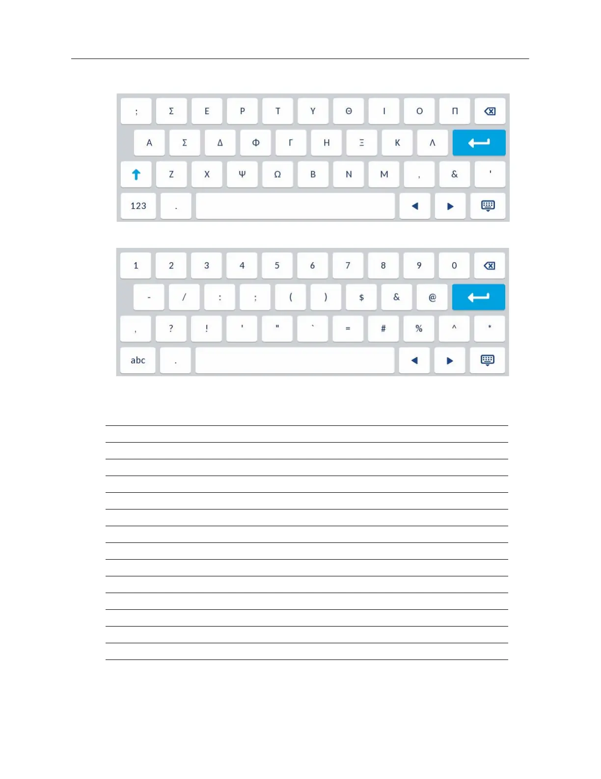 The diacritics and secondary characters available for the Greek keyboard include: