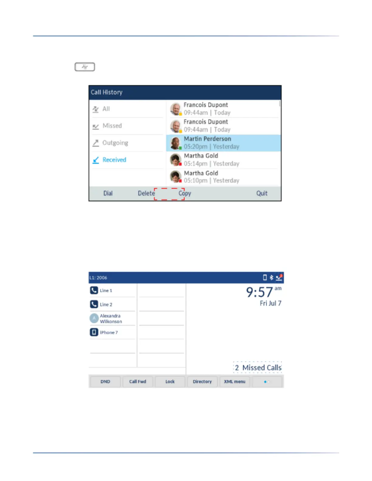 The IP phone has a missed calls indicator and icon that increments the number of missed calls to the