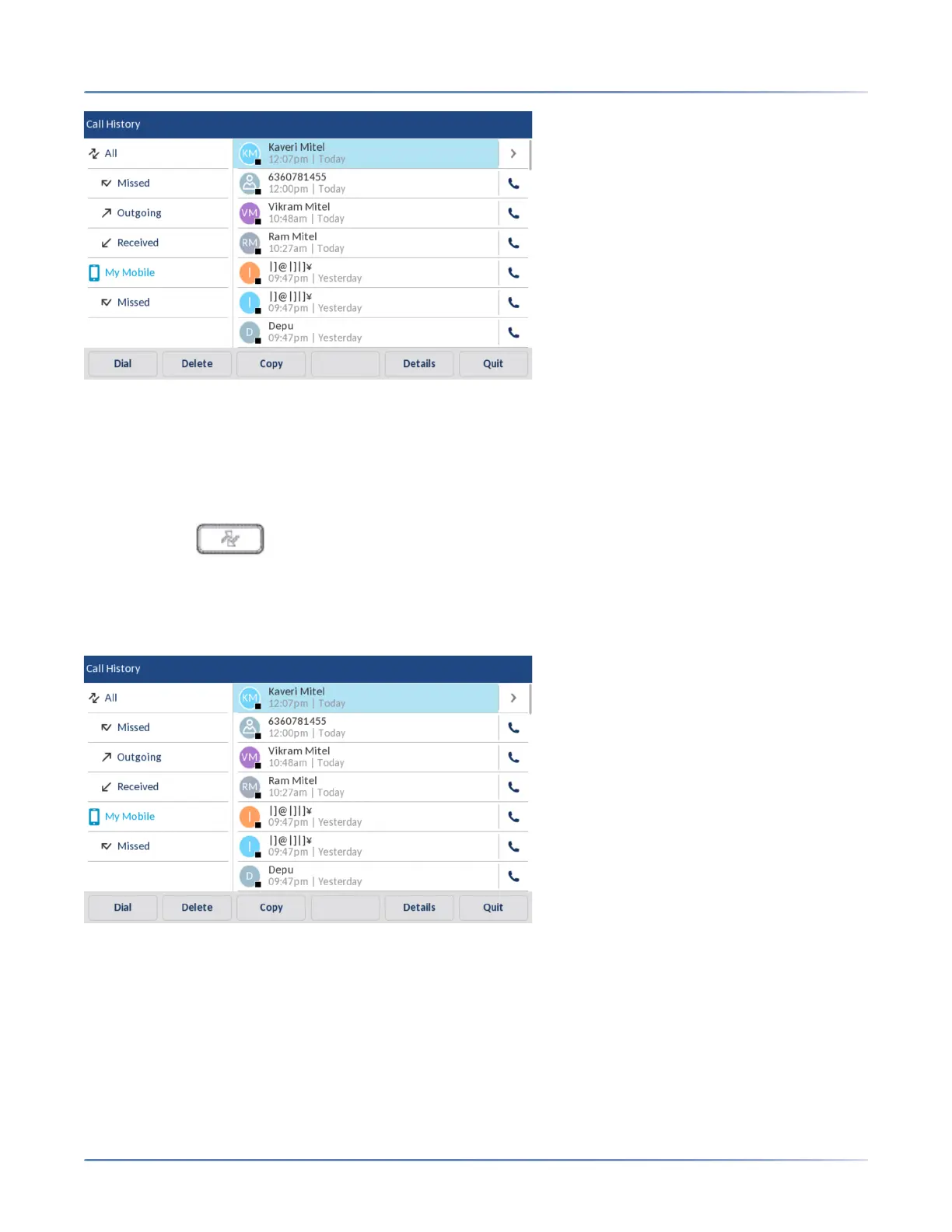 4. Tap an entry in the call history or missed calls selection column and then tap the right-arrow.