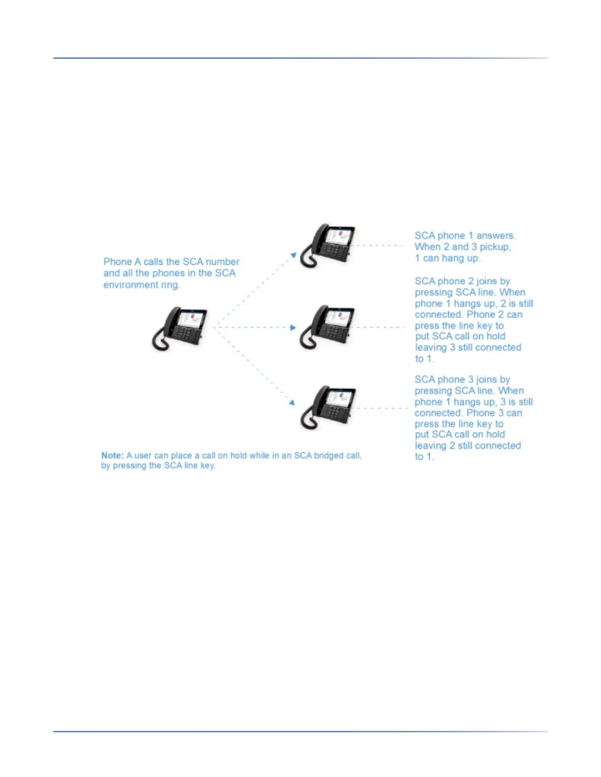 call by pressing the SCA line key. Phone 2 and 3 display the call they are bridging into on the LCD of the
