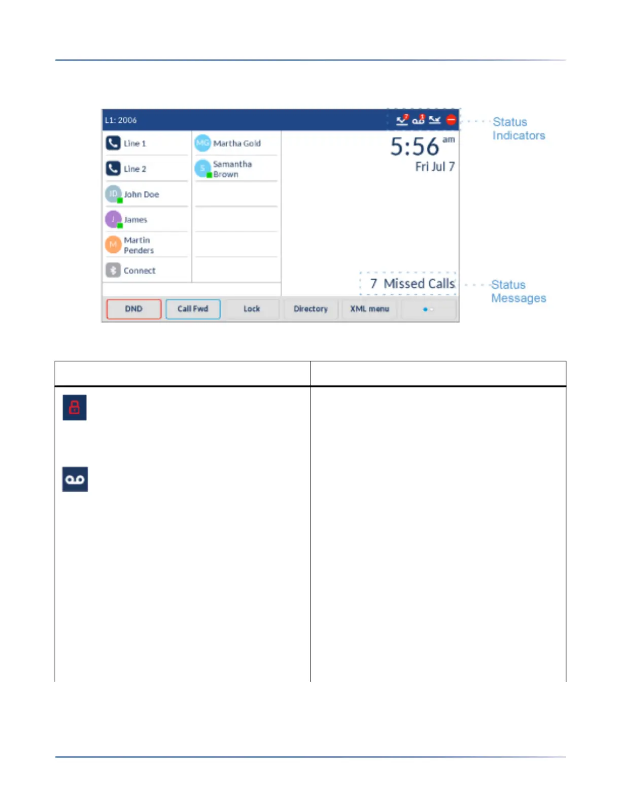 The following table identifies and describes the phone/line status indicators on the Home screen.