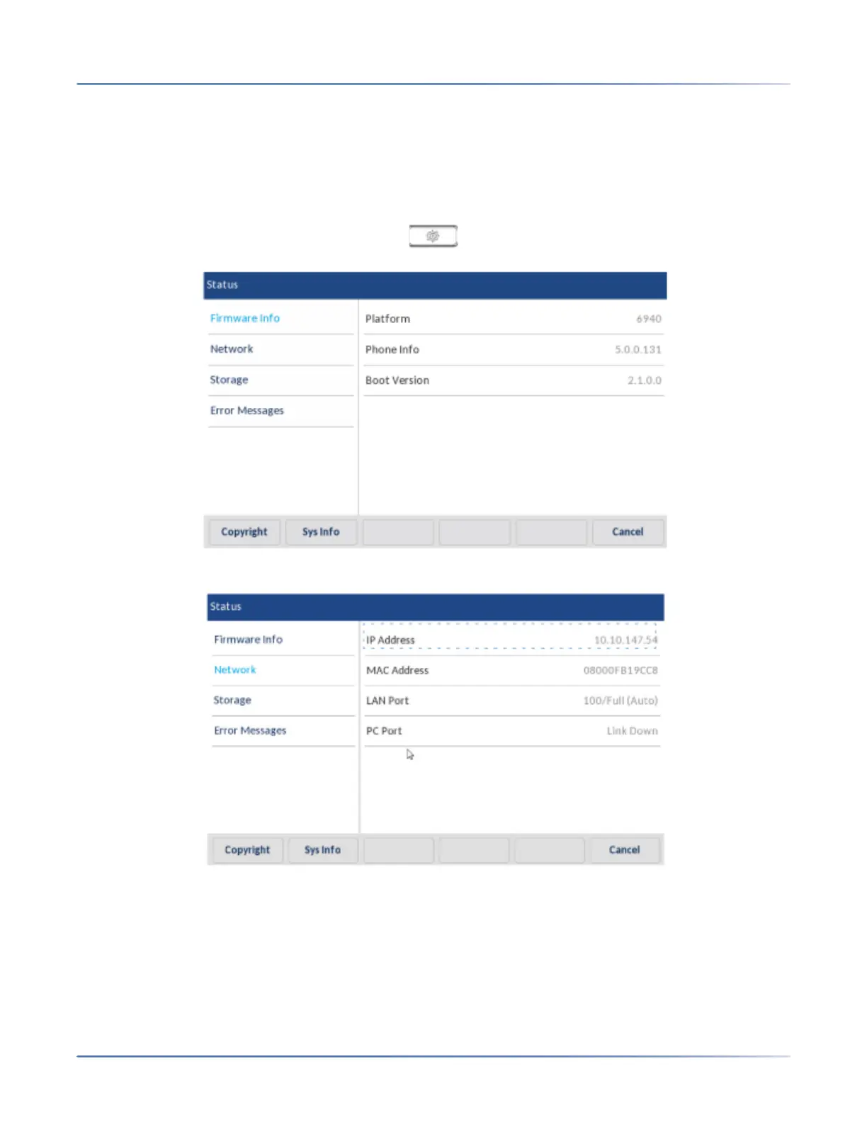 3. Press Network.The IP address of your 6940 displays in the IP Address field in the right column.