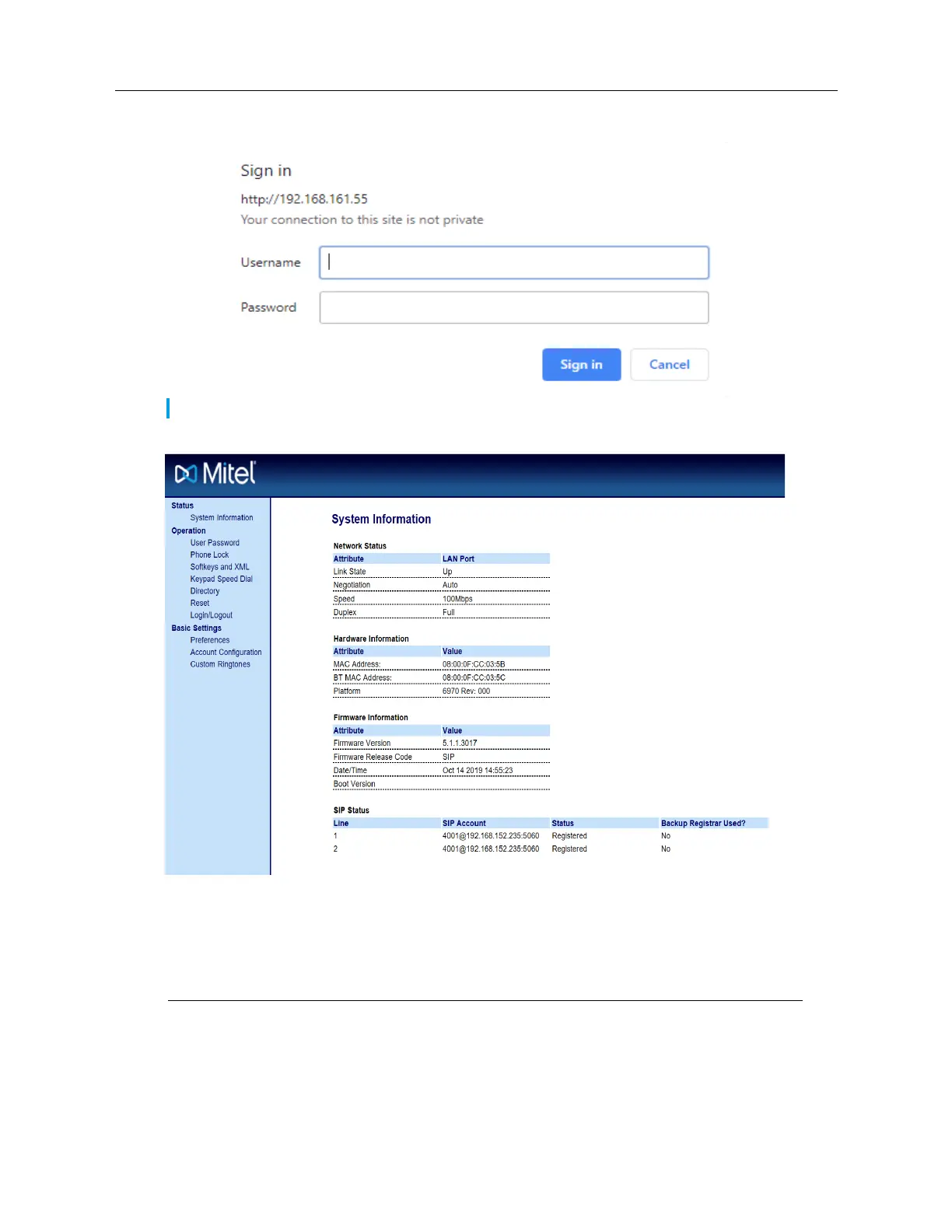 The following categories display in the side menu of the Mitel Web UI: Status, Operation, and Basic