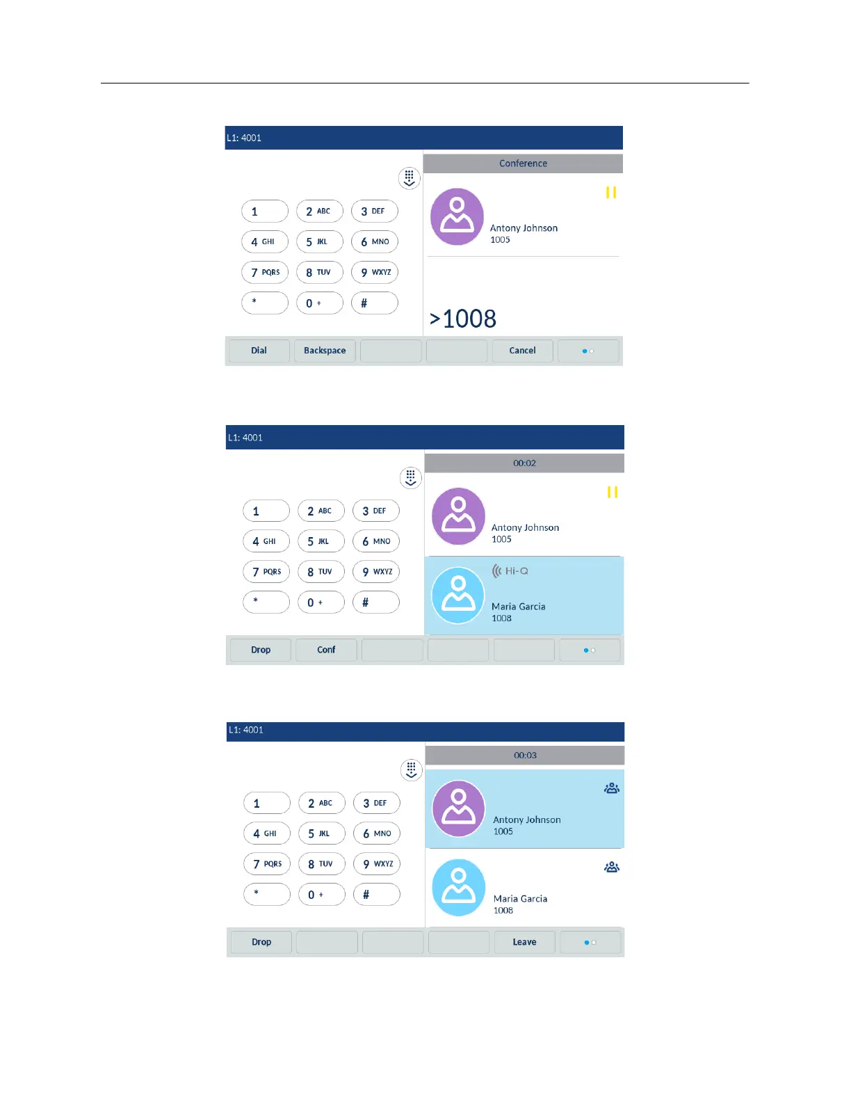 5. Tap the Conf softkey again to add Party 3 to the conference. Party 2 and Party 3 will connect