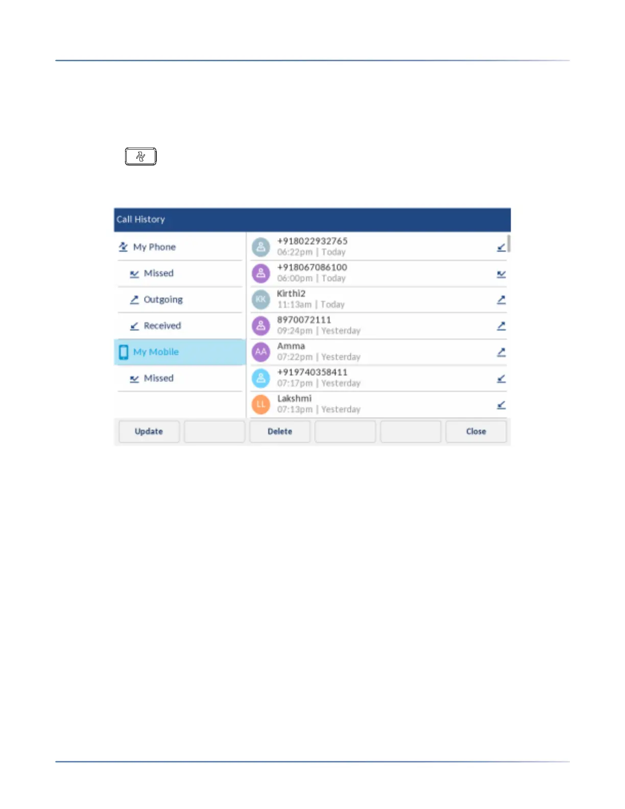 4. Tap an entry in the call history or missed calls selection column.