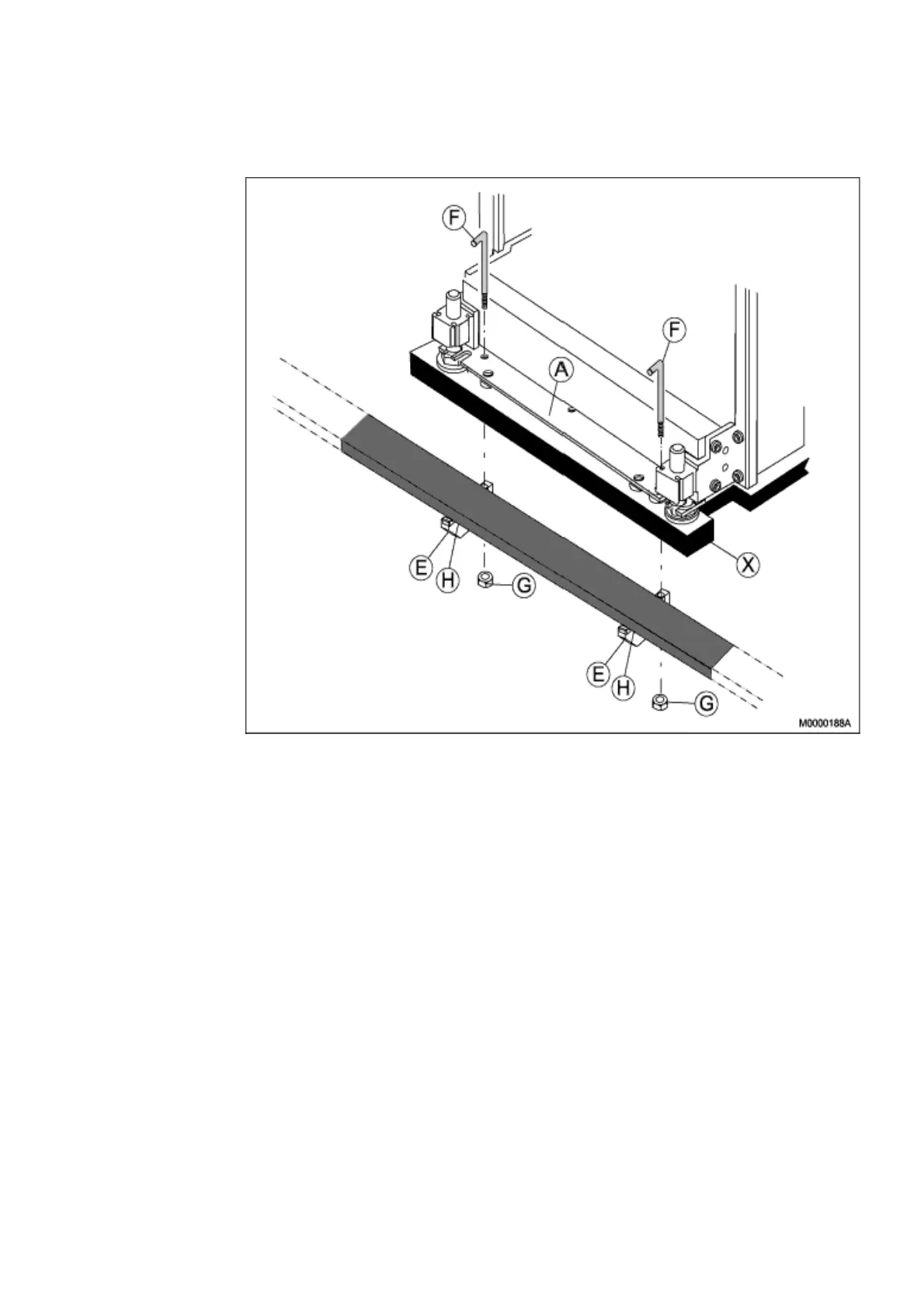 1. Insert two clamps (F) through the yoke (A) and the floor (X), see Figure