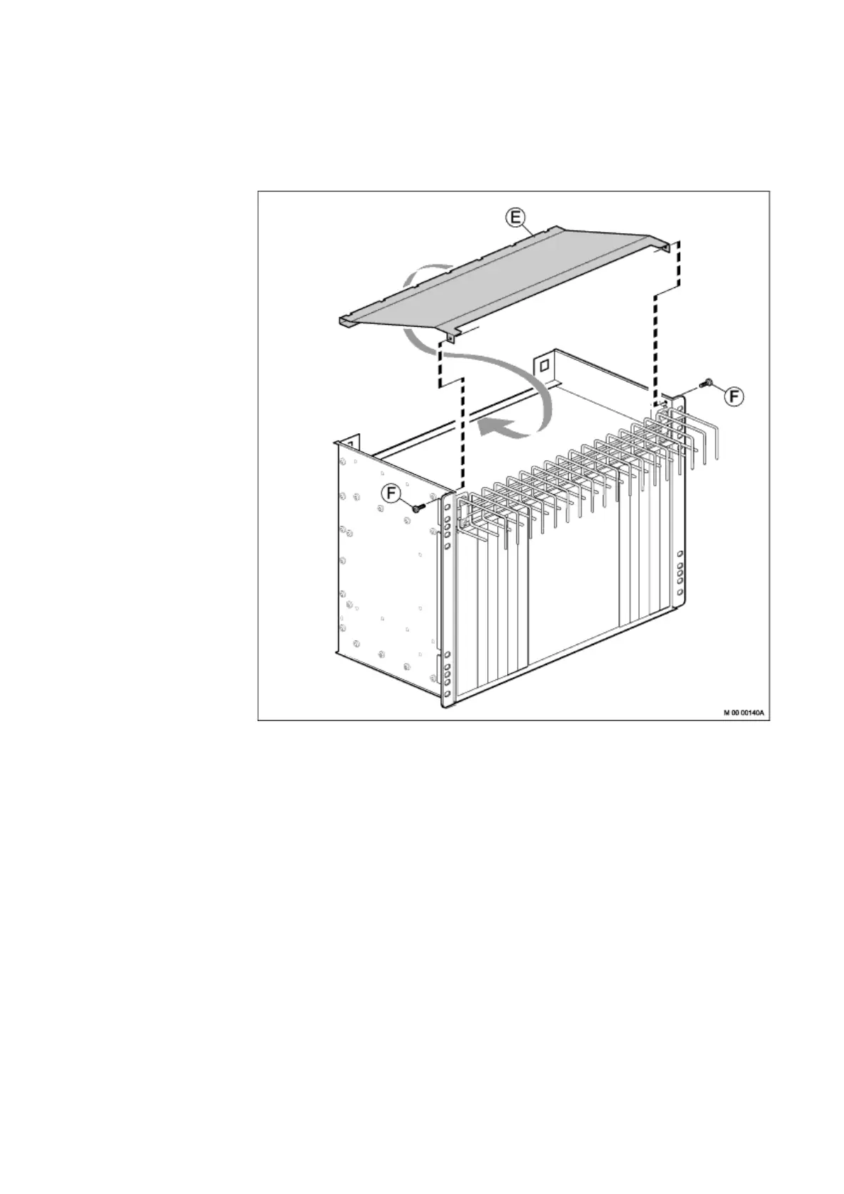 4. Fasten the air plate to the subrack from both sides using two screws (F).