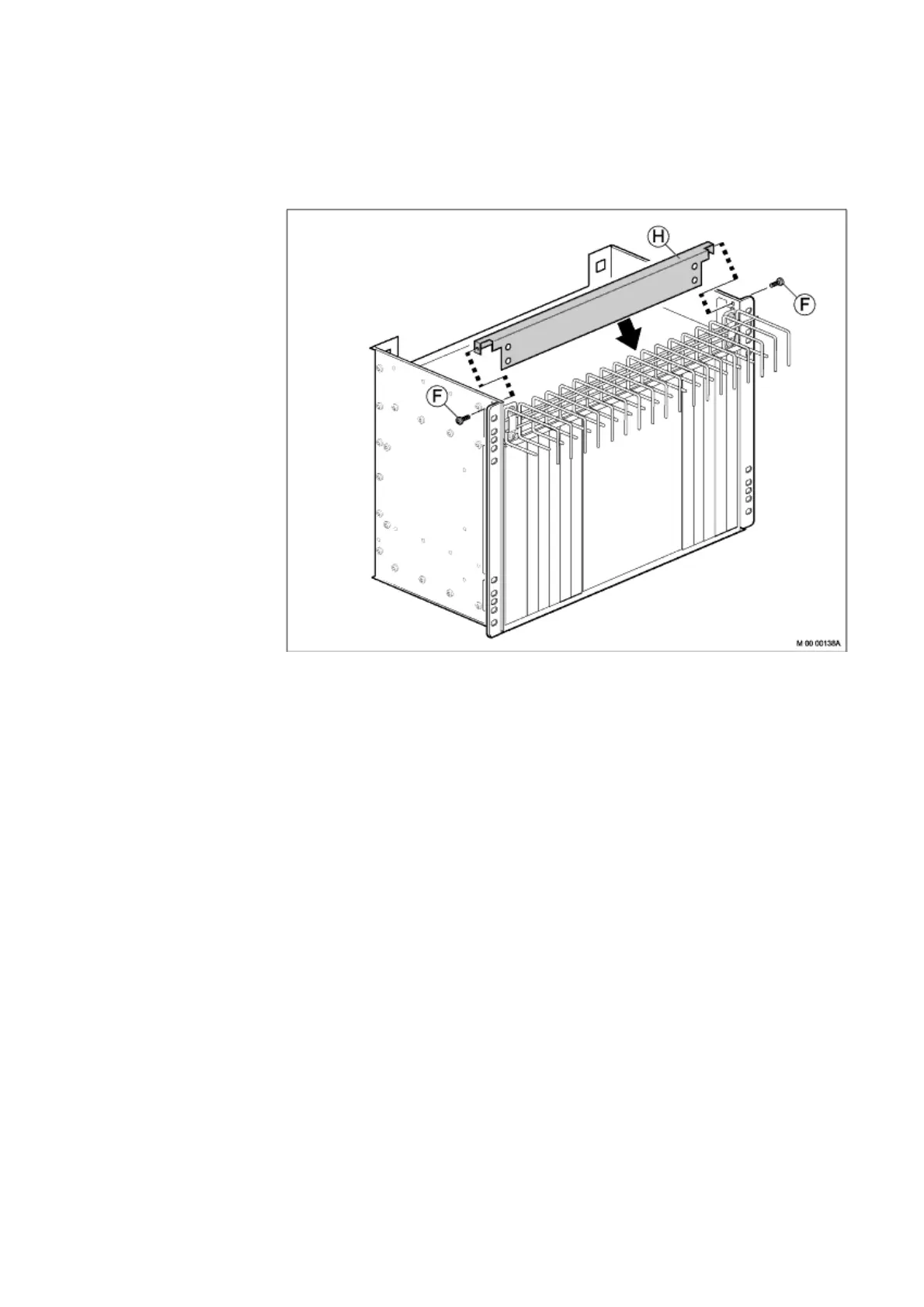 3. Fasten the front air plate to the subrack by using two screws (F).