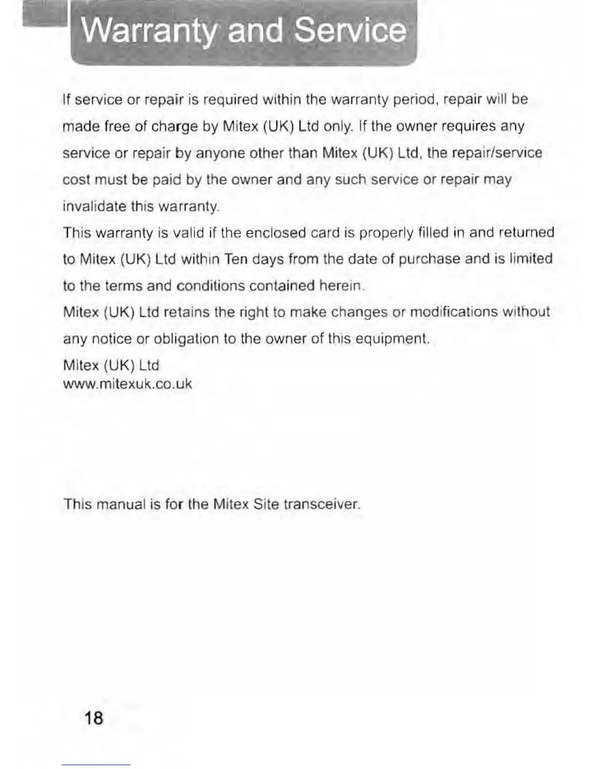 This manual is for the Mitex Site transceiver.