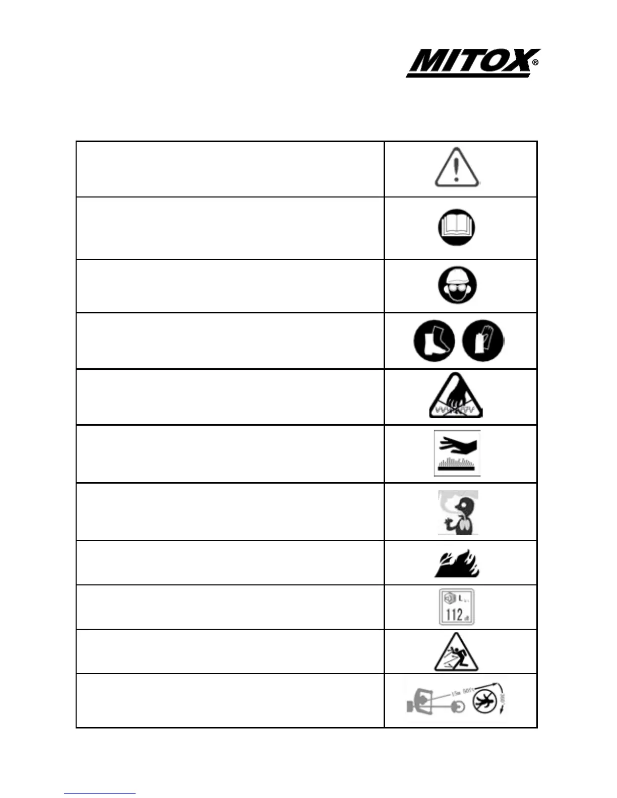 Mitox 281MT - Safety Symbols; General Danger and Caution Symbols; Personal Protective Equipment Symbols; Operational Safety Symbols