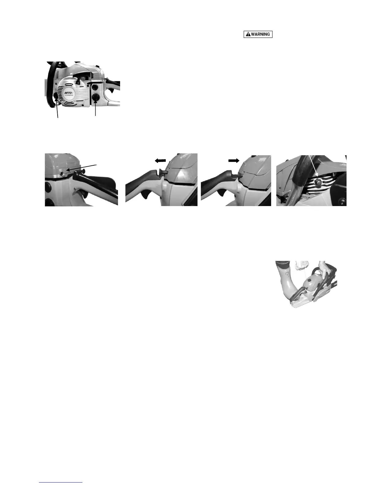 • Keep clear of the saw chain as it will start rotating when engine starts.